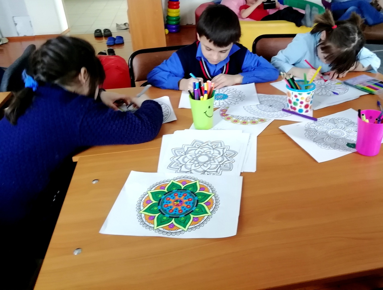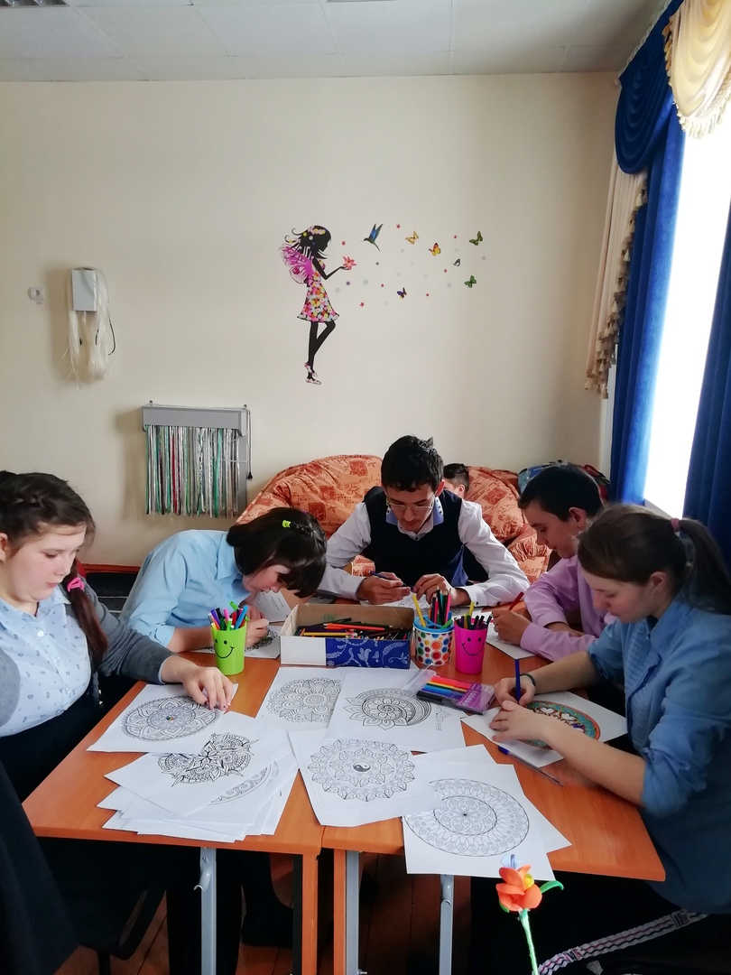 В кабинете педагога-психолога для учащихся 5-9 классов были подготовлены психологические картинки мандалы, которые необходимо было разрисовать. Психологическая игра-метафора «Мандала - как способ саморегуляции и снятия напряжения». Они помогли ребятам соприкоснуться с глубинной и сущностью цвета; активизировали знания детей в области психологии и изобразительного искусства. Данное мероприятие особо понравилось учащимся, поскольку итогом стали очень яркие и разнообразные мандалы.