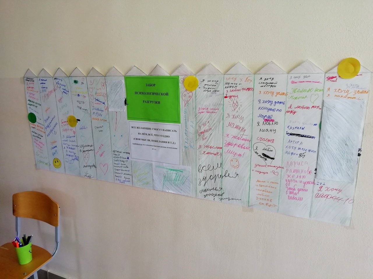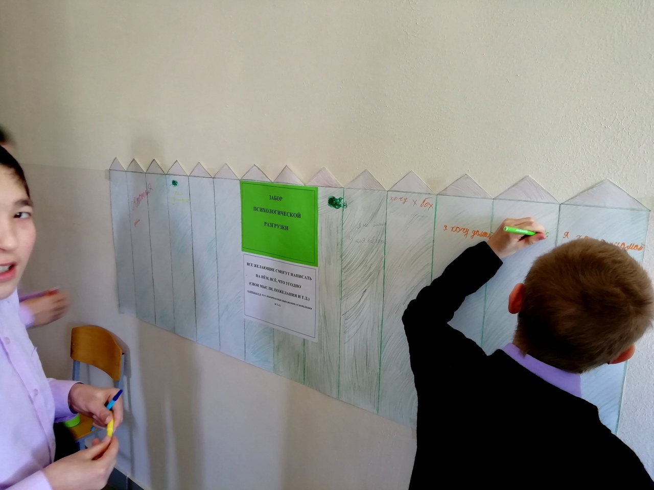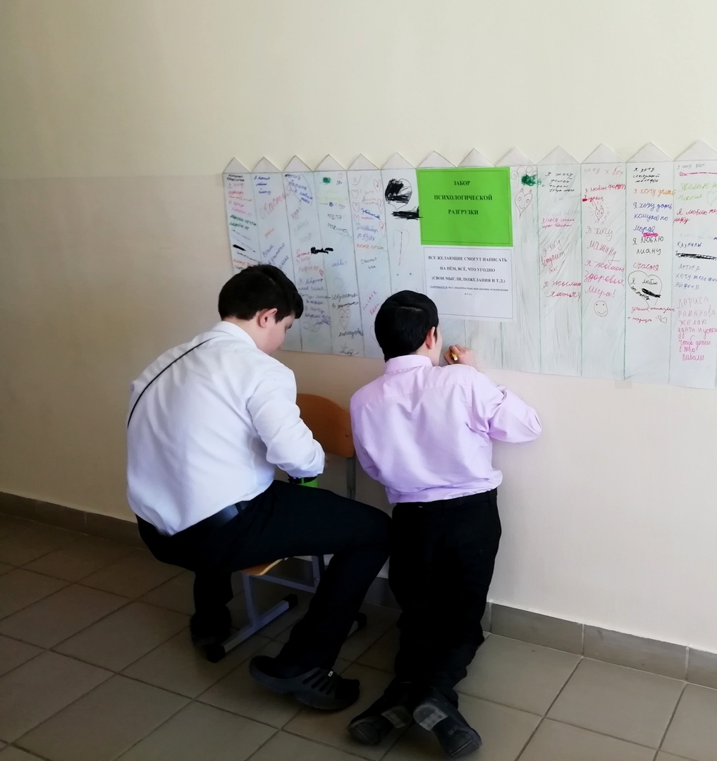 Во вторник для учащихся был подготовлен «Забор психологической разгрузки», на котором все желающие смогли написать свои, мысли, желания, пожелания. Дети активно принимали участие в данной акции. Забор пользовался огромным успехом – на нем не осталось ни сантиметра свободного пространства.