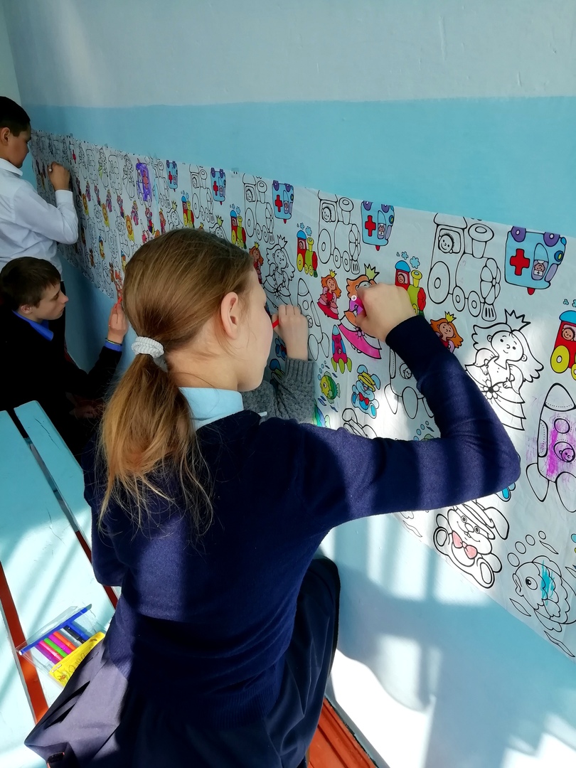 В коридоре младших классов педагог-психолог разместила скатерть-раскраску. Дети с удовольствием раскрашивали картинки.