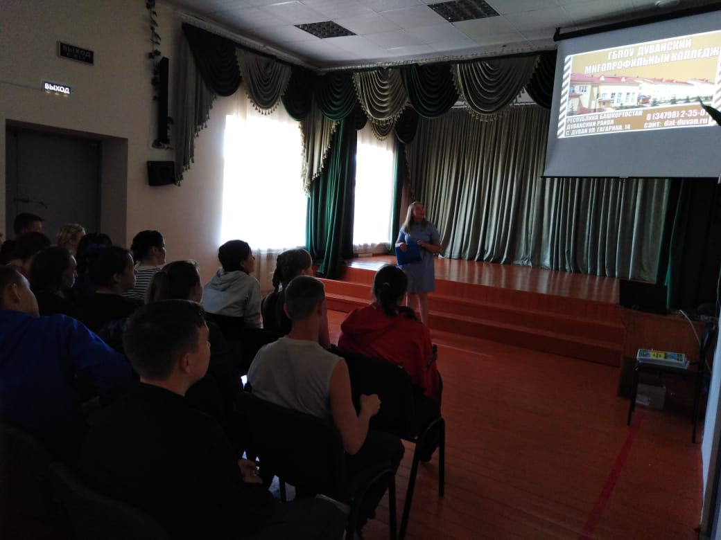 28 мая 2021 года в рамках профориентационной работы в школе организована встреча с представителями ГБПОУ Дуванского многопрофильного колледжа и обучающими 8-10 классов, на которой ребята узнали о истории колледжа, рассказали о специальностях, по которым готовят учащихся, условиях поступления. Для детей с ограниченными возможностями здоровья организовано обучение по специальности "Садовник".